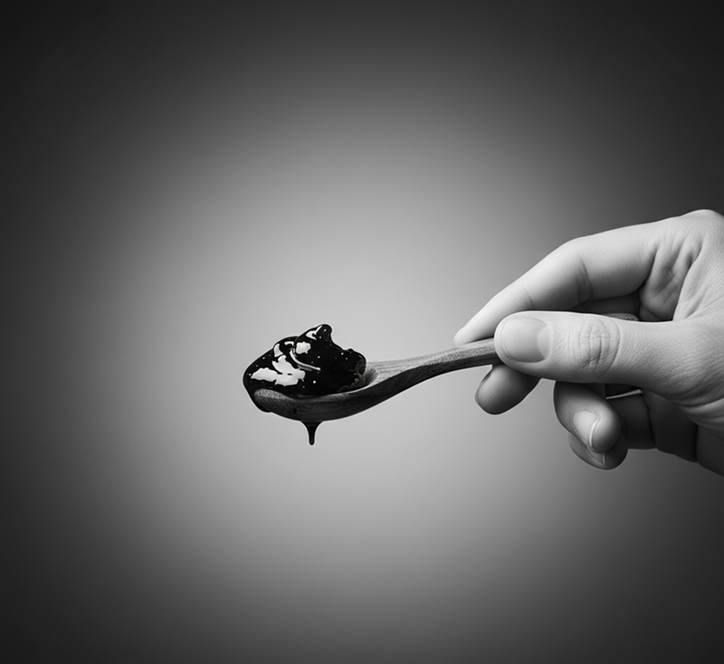 Take a pea-sized portion (about 300–500 mg) of pure Shilajit resin with the provided spoon.